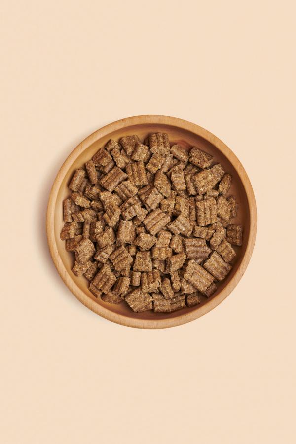 Lors du processus de pression à froid, tous les ingrédients sont soigneusement mélangés et transformés en croquettes dans une presse ; grâce à un processus de refroidissement spécialement mis au point, elles sont délicatement moulées sans vapeur ni températures élevées.