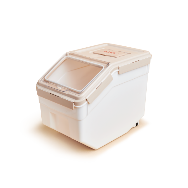 Pratico contenitore per alimenti secchi che può contenere fino a 5 kg di cibo. Si possono così riporre facilmente i sacchi grandi in cantina e avere sempre il pratico contenitore piccolo a portata di mano in cucina.