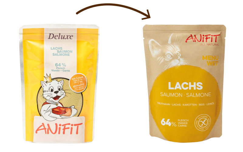 ANiFiT è sinonimo di alimenti naturali per animali domestici di alta qualità, e questo si riflette anche a livello visivo. Le ricette e quindi il contenuto dei nostri prodotti di alta qualità rimangono invariati. La dichiarazione aperta e onesta al 100% di tutti gli ingredienti si trova, come sempre, sul retro del prodotto e sulla pagina del prodotto nello Shop online. Il nuovo design della confezione è semplificato e più strutturato, per aiutare a cogliere rapidamente tutte le informazioni. Al centro si trovano i colori verde e giallo, che rappresentano i rispettivi assortimenti peri cani o gatti. I prodotti adatti a cani e gatti appaiono ora in marrone, in modo che sia chiaramente facile vedere per quale tipo di animale è adatto il cibo.